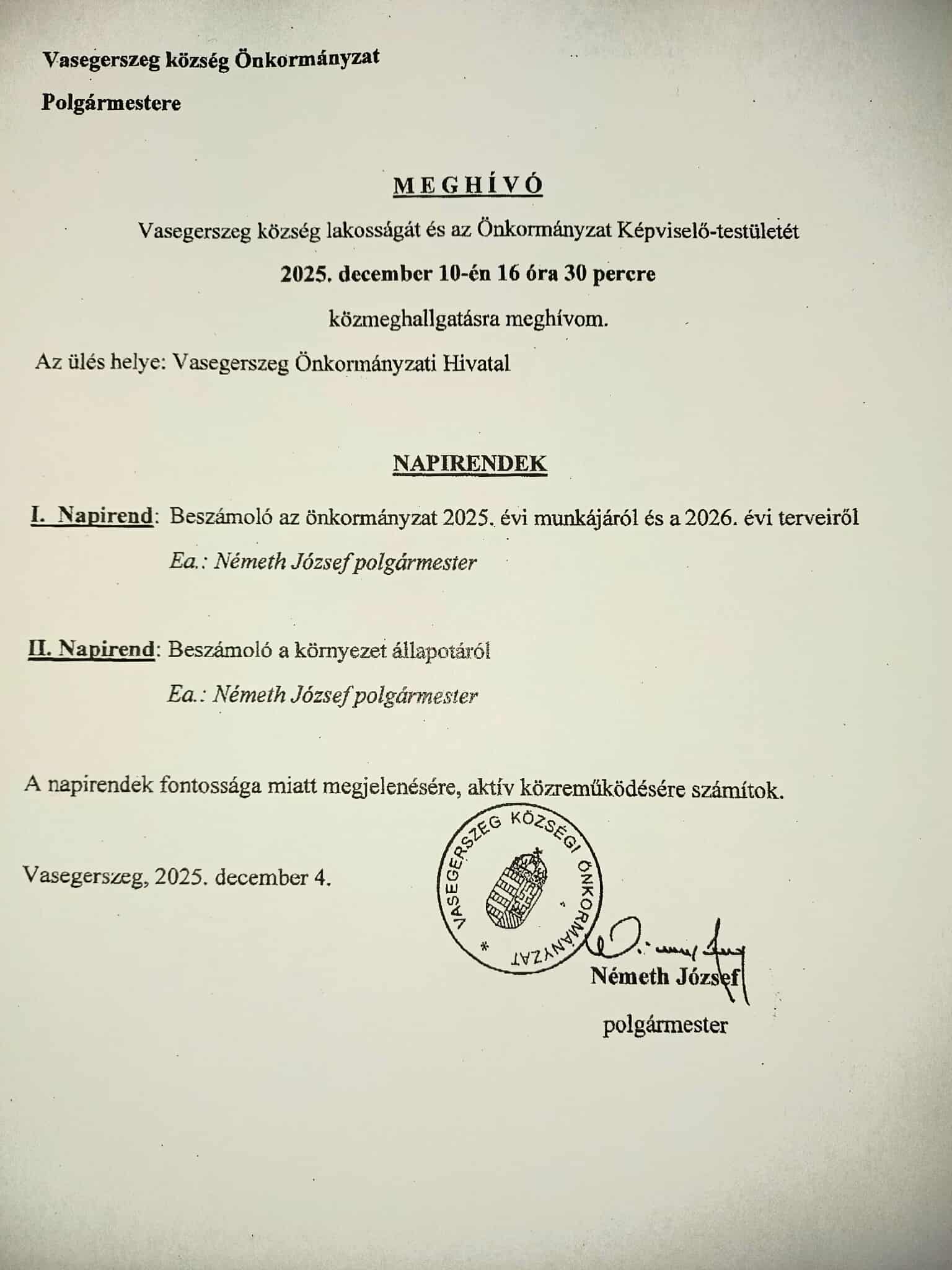 Vasegerszeg Községi Önkormányzat az előbbi évekhez hasonlóan